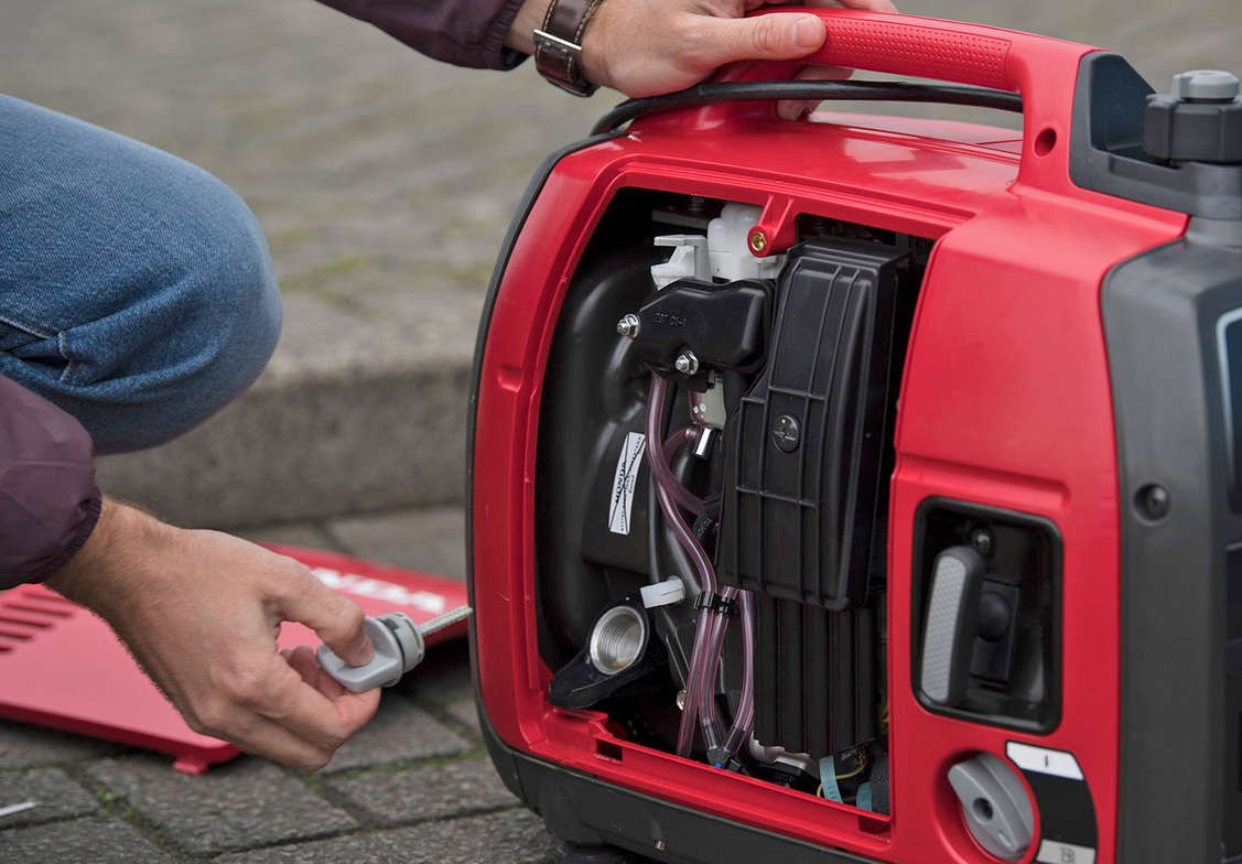 Техническое обслуживание генератора легко осуществлять благодаря специальным дверцам в корпусе. Замена моторного масла, необходимая каждые 100 часов работы, проводится легче и чище благодаря удобно расположенному стоку слива отработанного масла. Уменьшен риск пролива масла благодаря удлиненному резиновому желобу для сдерживания масла во время опустошения маслосборника, а увеличенная в диаметре заливная горловина позволяет заливать масло прямо из канистры без нужды в воронке (применимо не ко всем емкостям для масла).